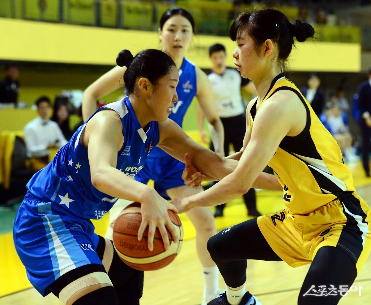 16일 충북 청주체육관에서 열린 ‘하나은행 2024-2025 여자프로농구’ KB와 우리은행의 경기에서 우리은행 이민지와 KB 허예은이 볼다툼을 벌이고 있다. 청주 | 김민성 기자 marineboy@donga.com