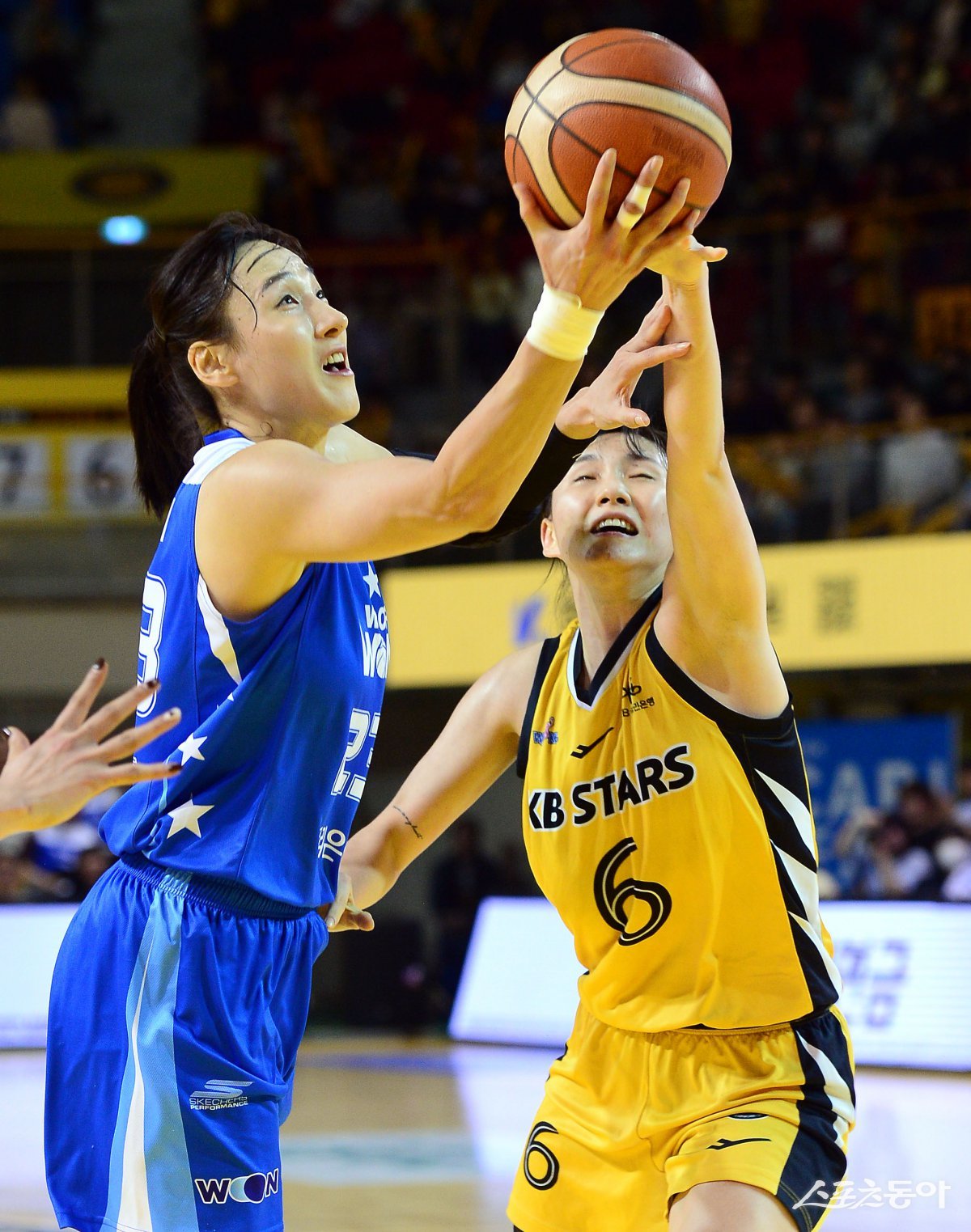 16일 충북 청주체육관에서 열린 ‘하나은행 2024-2025 여자프로농구’ KB와 우리은행의 경기에서 우리은행 김단비가 KB 이윤미의 수비를 피해 슛을 쏘고 있다. 청주 | 김민성 기자 marineboy@donga.com