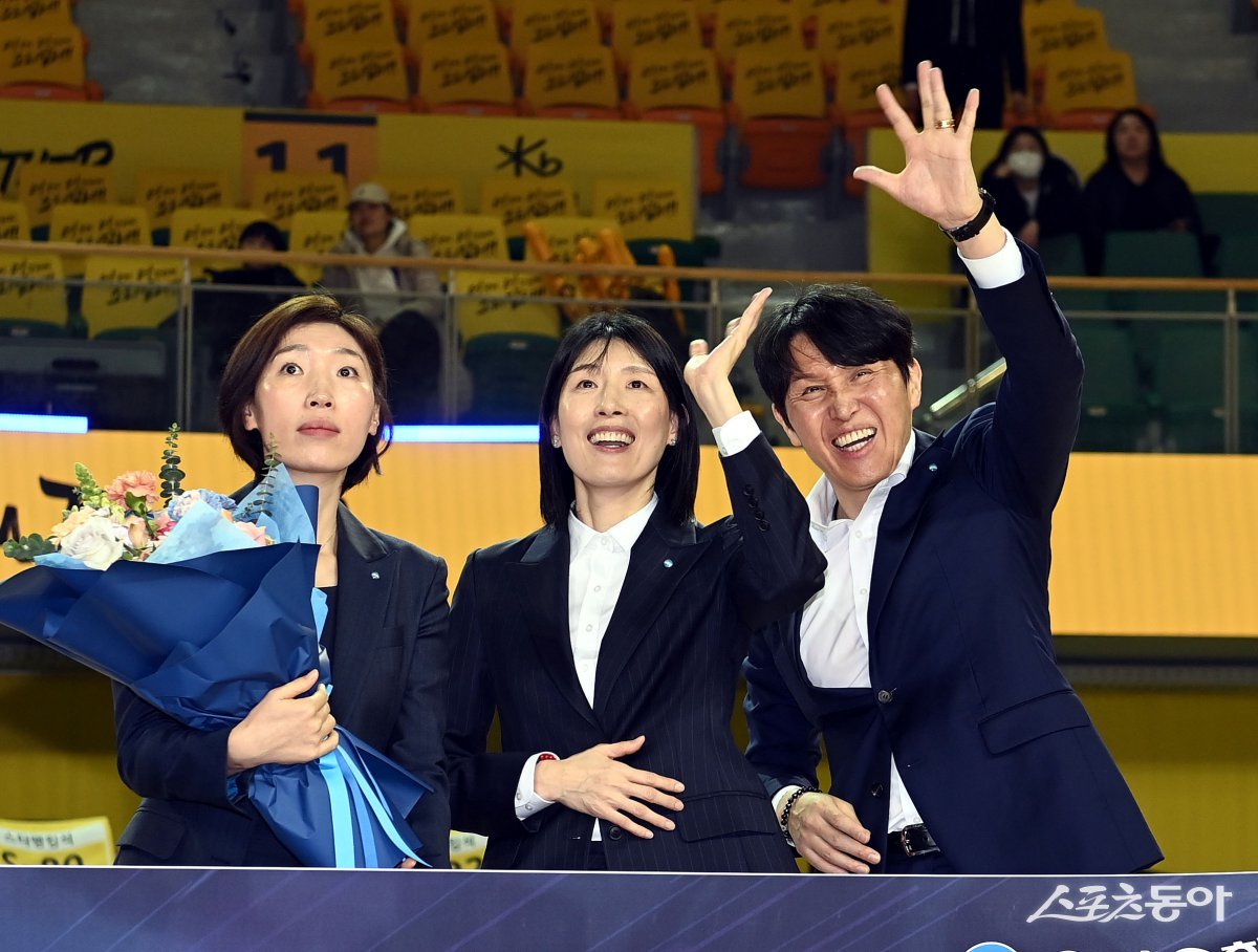 16일 충북 청주체육관에서 열린 ‘하나은행 2024-2025 여자프로농구’ KB와 우리은행의 경기에서 우리은행이 KB를 상대로 46-44 승리하며 정규리그 우승 후 임영희 코치, 전주원 코치, 위성우 감독이 기뻐하고 있다. 청주 | 김민성 기자 marineboy@donga.com