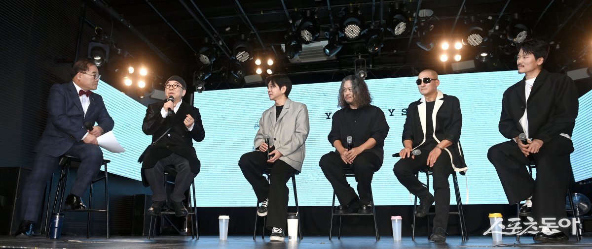 밴드 YB가 17일 서울 마포구 롤링홀에서 열린 새 EP 앨범 ‘오디세이(ODYSSEY)’ 발매 쇼케이스를 가졌다. 가수 김수철이 깜짝 방문해 이야기를 나누고 있다. 김종원 기자 .won@donga.com