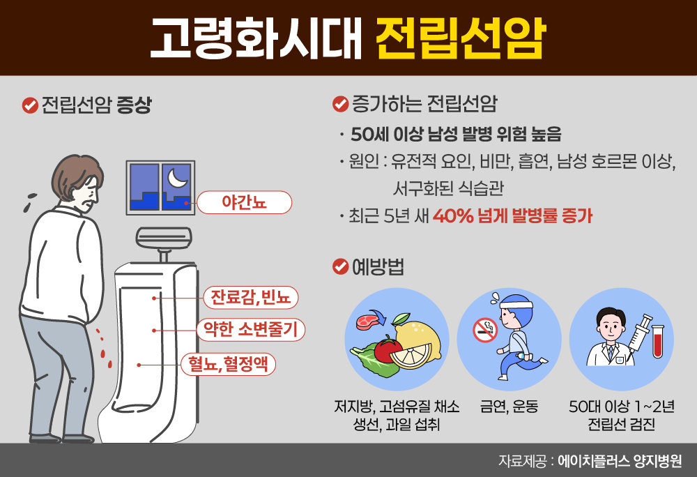 전립선암은 50세 이상 남성에게 발병 위험이 높고 유전적 요인, 비만, 흡연, 남성 호르몬 이상과 서구화된 식습관이 주 원인으로 최근 5년 새 40% 넘게 발병률이 증가했다.