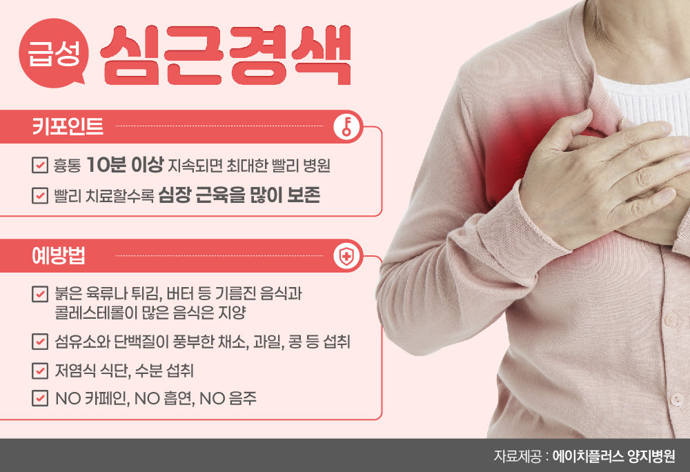 급성 심근경색은 초기 사망률이 40%로 증상 발현 후에 병원으로 옮겨 치료해도 병원 내 사망률이 5~10%에 이른다. 급성 심근경색의 대표적인 전조증상은 가슴 통증이다. 가슴을 조이거나 쥐어짜는 듯한 통증이 나타나는데, 통증이 10분 이상 지속되면 참지 말고 최대한 빨리 병원으로 가야 한다.