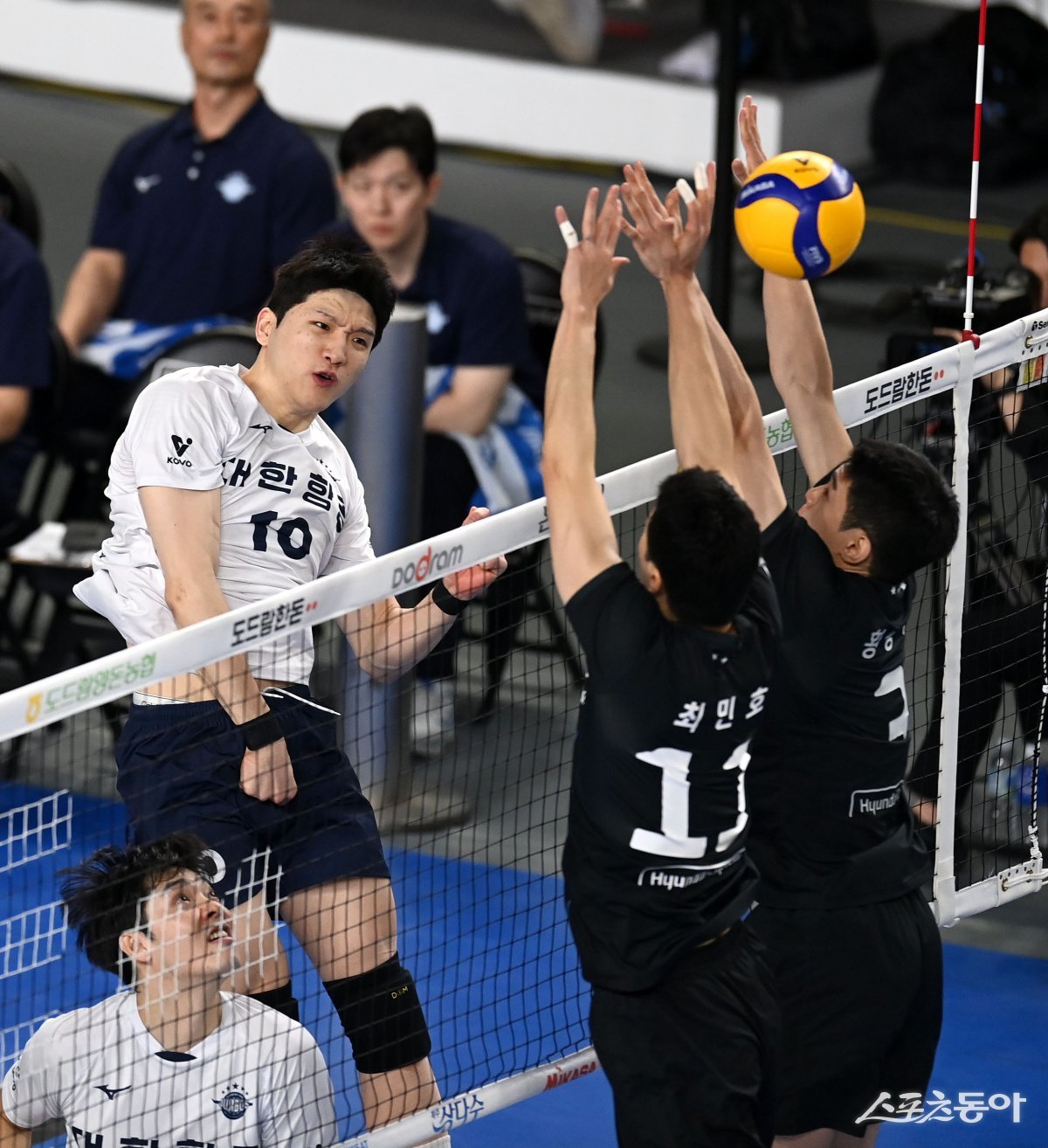 18일 천안유관순체육관에서 열린 ‘도드람 2024~2025 V-리그’ 남자부 현대캐피탈과 대한항공 경기에서 대한항공 정지석이 현대캐피탈의 블로킹 사이로 스파이크를 날리고 있다. 천안 | 김종원 기자 won@donga.com