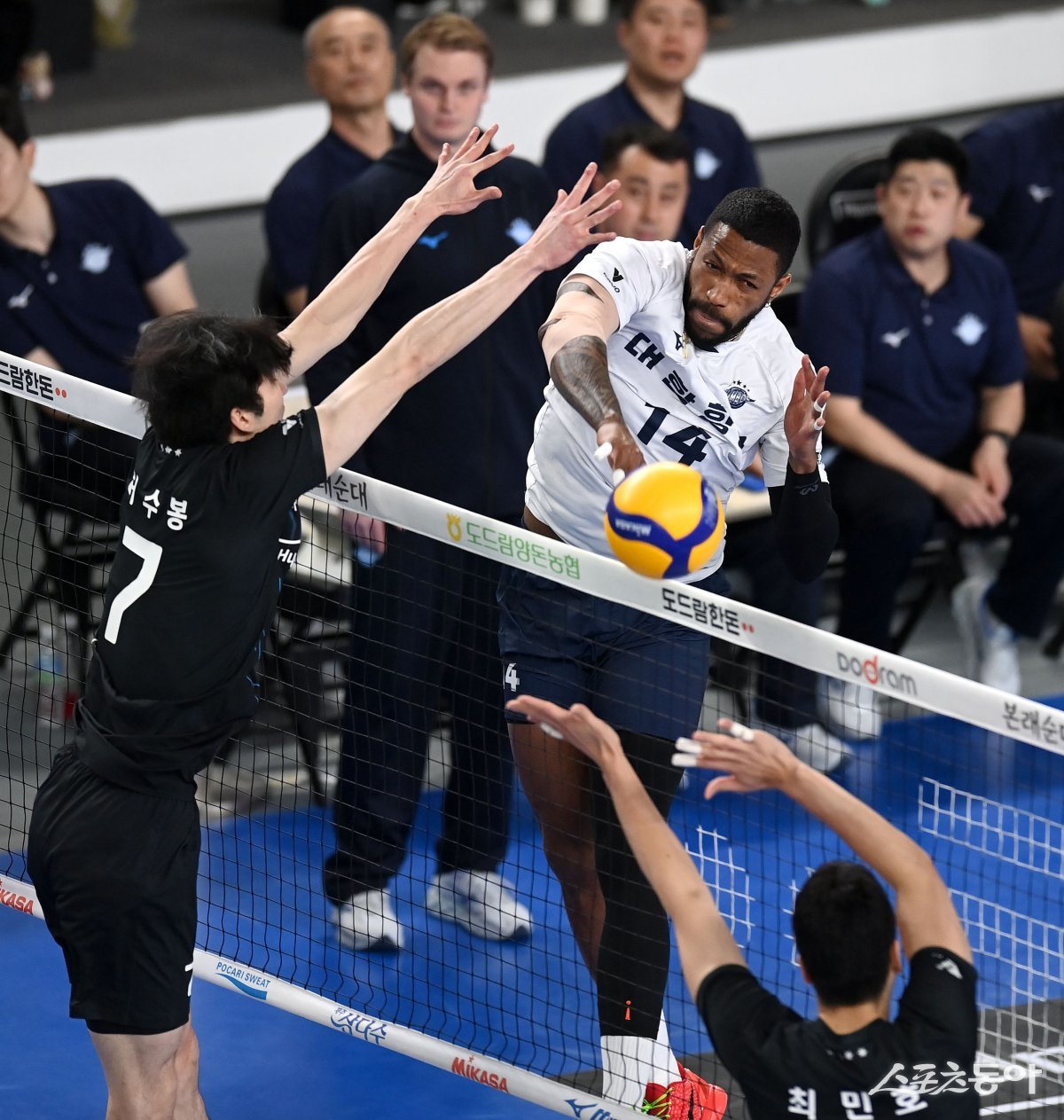 18일 천안유관순체육관에서 열린 ‘도드람 2024~2025 V-리그’ 남자부 현대캐피탈과 대한항공 경기에서 대한항공 요스바니가 현대캐피탈의 블로킹 사이로 스파이크를 날리고 있다. 천안 | 김종원 기자 won@donga.com