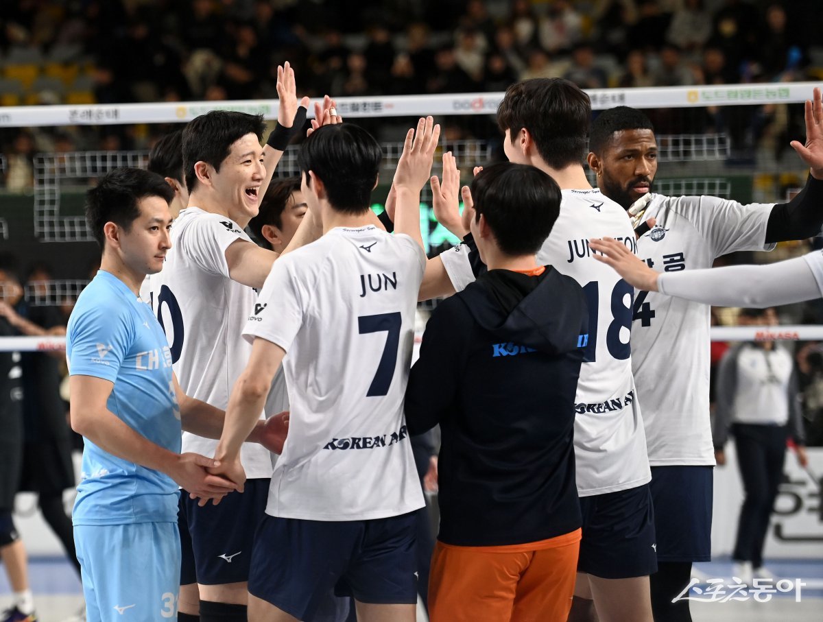 18일 천안유관순체육관에서 열린 ‘도드람 2024~2025 V-리그’ 남자부 현대캐피탈과 대한항공 경기에서 세트스코어 3-1 승리를 거둔 대한항공 선수들이 기뻐하고 있다. 천안 | 김종원 기자 won@donga.com