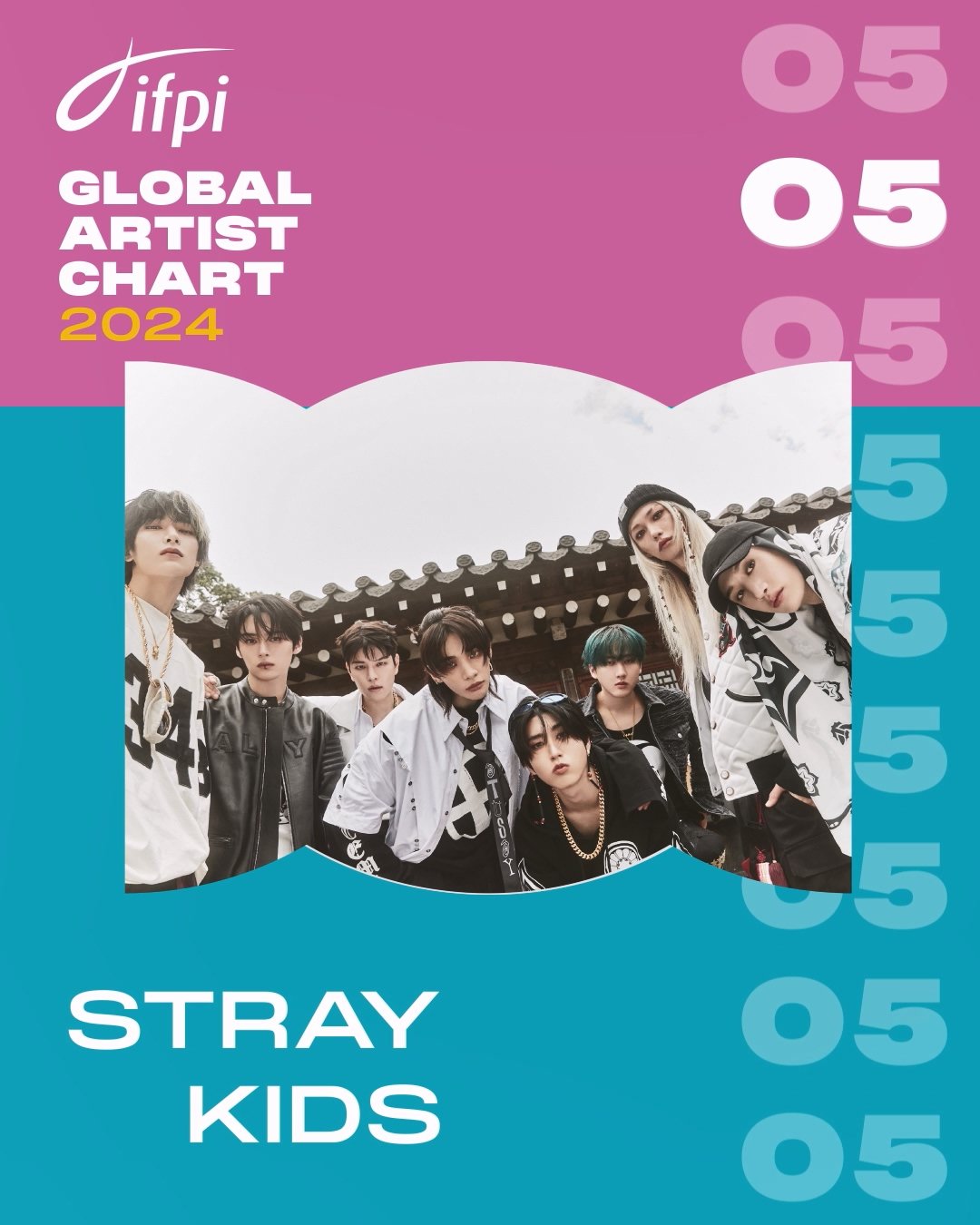 스트레이 키즈는 ‘글로벌 아티스트 차트’ 5위에 올라 2022년 해당 차트 첫 진입 이래 3년 연속 랭크인에 성공했다. ‘글로벌 앨범 차트’에서는 미니 앨범 ‘ATE’(에이트)로 10위를 기록했다. 2022년 ‘MAXIDENT’(맥시던트), 2023년 ‘★★★★★ (5-STAR)’(파이브스타)와 ‘樂-STAR’(락스타) 등 해당 차트서 두각을 나타내 온 스트레이 키즈가 올해도 톱 10에 등극하고 인기를 입증했다.