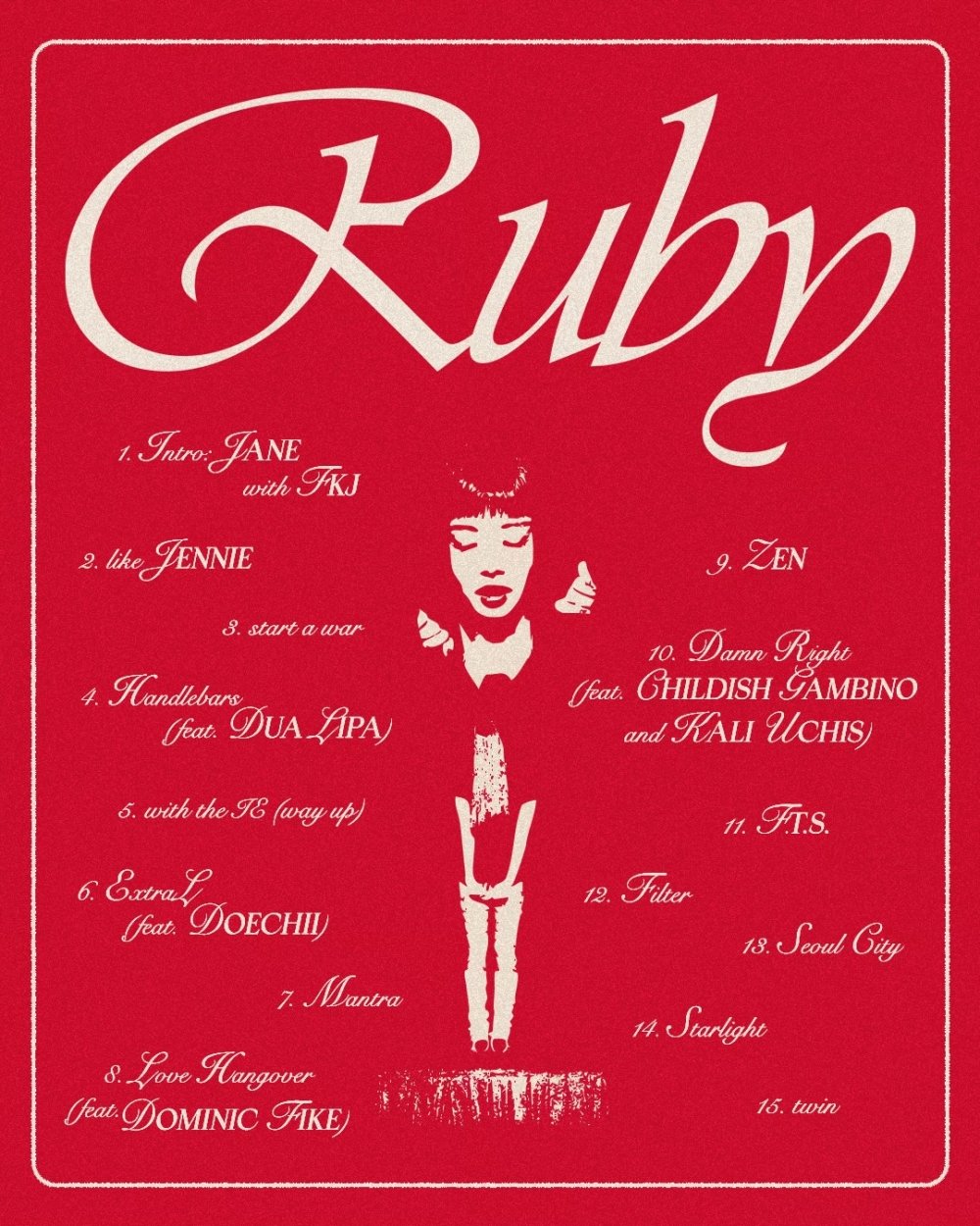 19일 제니는 공식 SNS에 오는 3월 7일 발매되는 첫 번째 솔로 정규 앨범 ‘Ruby’(루비)의 트랙리스트를 공개했다. 트랙리스트에 따르면, 선공개된 ‘Mantra’(만트라)와 ‘ZEN’(젠), ‘Love Hangover (feat. Dominic Fike)’(러브 행오버), ‘ExtraL (feat. Doechii)’(엑스트라L)을 포함한 다양한 장르의 총 15곡이 수록된다.