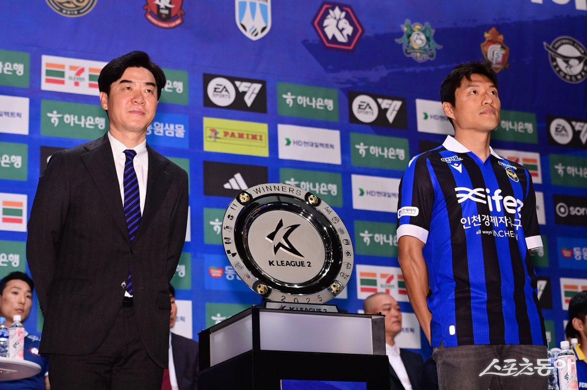 인천 유나이티드 윤정환 감독, 이명주가 19일 서울 마포구 상암동 누리꿈스퀘어 비즈니스타워 국제회의실에서 열린 ‘하나은행 K리그2 2025 개막 미디어데이’에서 포즈를 취하고 있다. 주현희 기자 teth1147@donga.com