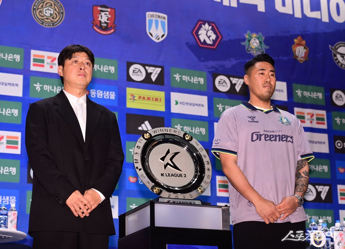 안산 이관우 감독, 이승빈이 19일 서울 마포구 상암동 누리꿈스퀘어 비즈니스타워 국제회의실에서 열린 ‘하나은행 K리그2 2025 개막 미디어데이’에서 포즈를 취하고 있다. 주현희 기자 teth1147@donga.com