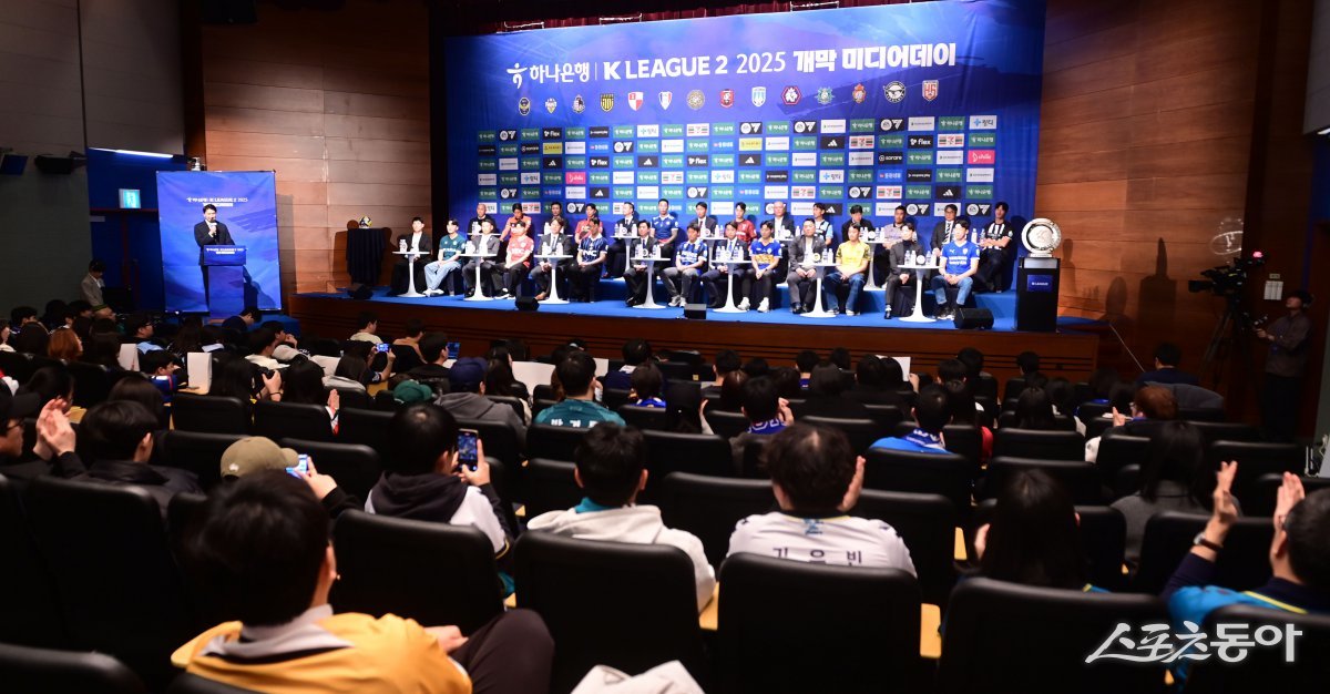 14개 팀 감독과 대표 선수들이 19일 서울 마포구 상암동 누리꿈스퀘어 비즈니스타워 국제회의실에서 열린 ‘하나은행 K리그2 2025 개막 미디어데이’에서 취재진의 질문에 답하고 있다. 주현희 기자 teth1147@donga.com