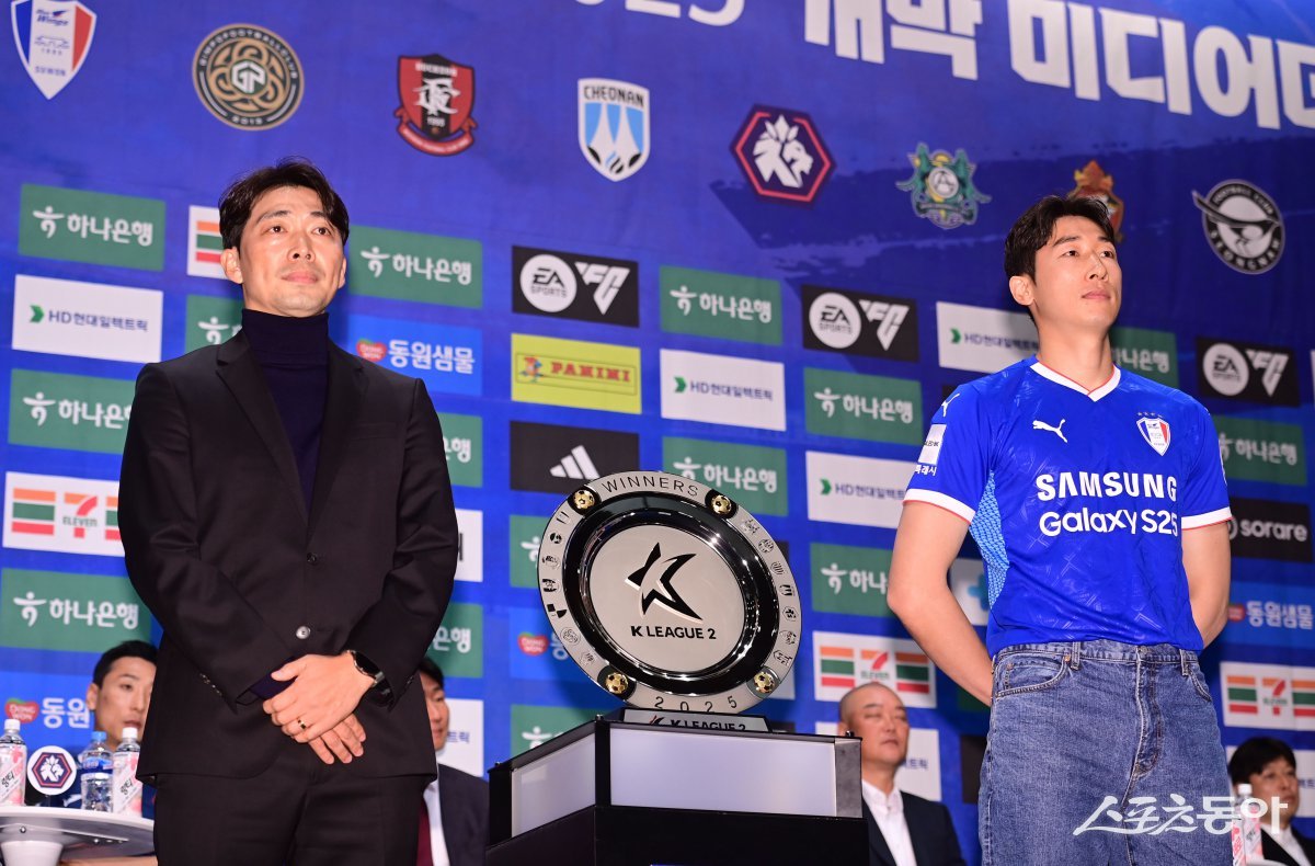 수원삼성 변성환 감독, 양형모가 19일 서울 마포구 상암동 누리꿈스퀘어 비즈니스타워 국제회의실에서 열린 ‘하나은행 K리그2 2025 개막 미디어데이’에서 포즈를 취하고 있다. 주현희 기자 teth1147@donga.com