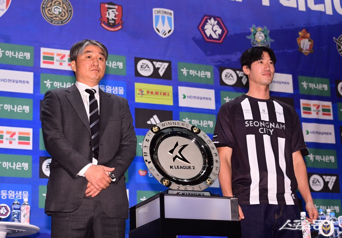 성남FC 전경준 감독, 김주원이 19일 서울 마포구 상암동 누리꿈스퀘어 비즈니스타워 국제회의실에서 열린 ‘하나은행 K리그2 2025 개막 미디어데이’에서 포즈를 취하고 있다. 주현희 기자 teth1147@donga.com