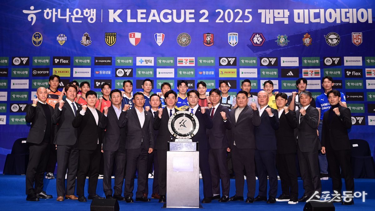 14개팀 감독과 대표 선수들이 19일 서울 마포구 상암동 누리꿈스퀘어 비즈니스타워 국제회의실에서 열린 ‘하나은행 K리그2 2025 개막 미디어데이’에서 포즈를 취하고 있다. 주현희 기자 teth1147@donga.com