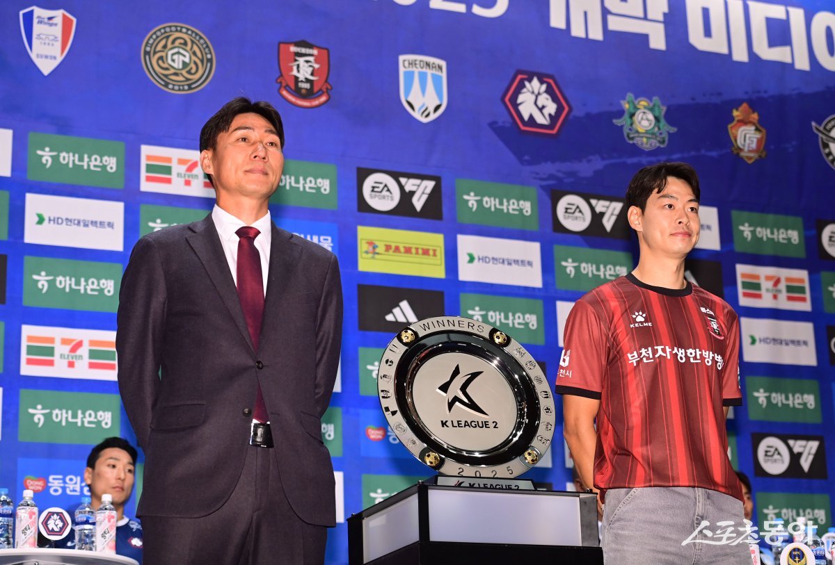 부천FC 이영민 감독, 한지호가 19일 서울 마포구 상암동 누리꿈스퀘어 비즈니스타워 국제회의실에서 열린 ‘하나은행 K리그2 2025 개막 미디어데이’에서 포즈를 취하고 있다. 주현희 기자 teth1147@donga.com