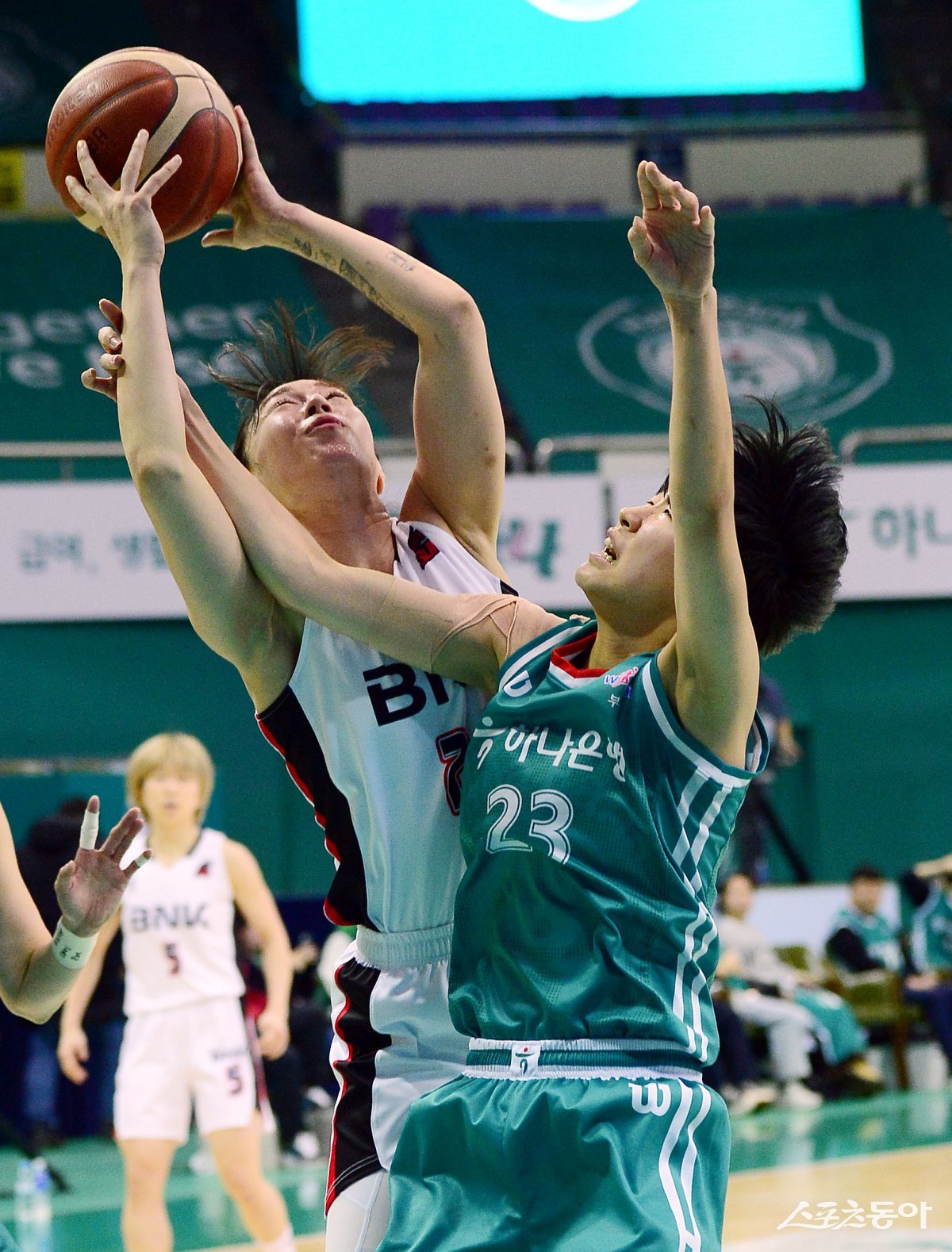 19일 경기도 부천체육관에서 열린 ‘하나은행 2024-2025 여자프로농구’ 하나은행과 BNK 썸의 경기에서 BNK 썸 김소니아와 하나은행 박진영이 리바운드를 다투고 있다. 부천 | 김민성 기자 marineboy@donga.com