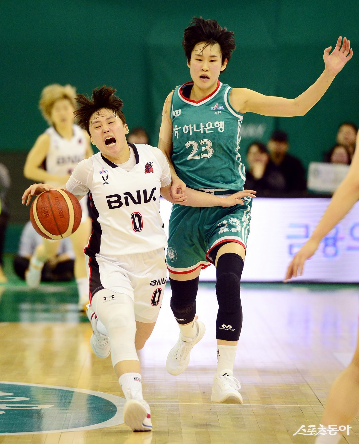 19일 경기도 부천체육관에서 열린 ‘하나은행 2024-2025 여자프로농구’ 하나은행과 BNK 썸의 경기에서 BNK 썸 심수현이 하나은행 박진영의 수비를 제치며 돌파하고 있다. 부천 | 김민성 기자 marineboy@donga.com