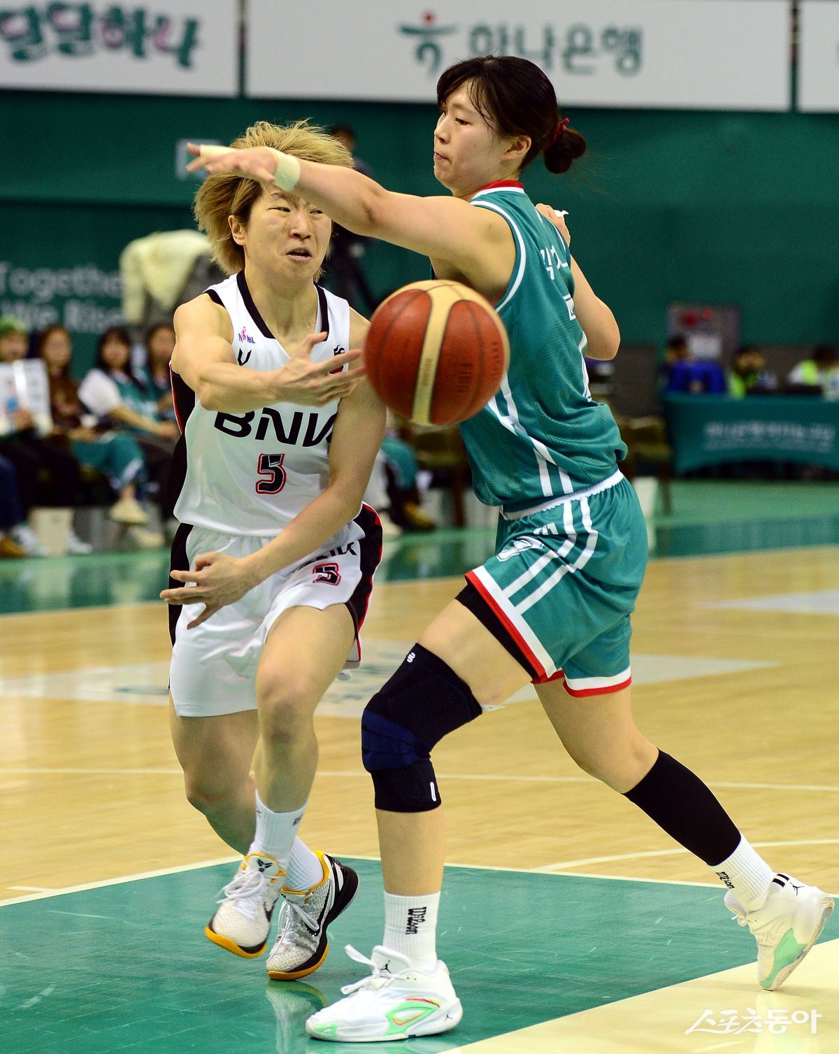 19일 경기도 부천체육관에서 열린 ‘하나은행 2024-2025 여자프로농구’ 하나은행과 BNK 썸의 경기에서 BNK 썸 안혜지가 하나은행 김하나의 수비를 피해 패스하고 있다. 부천 | 김민성 기자 marineboy@donga.com