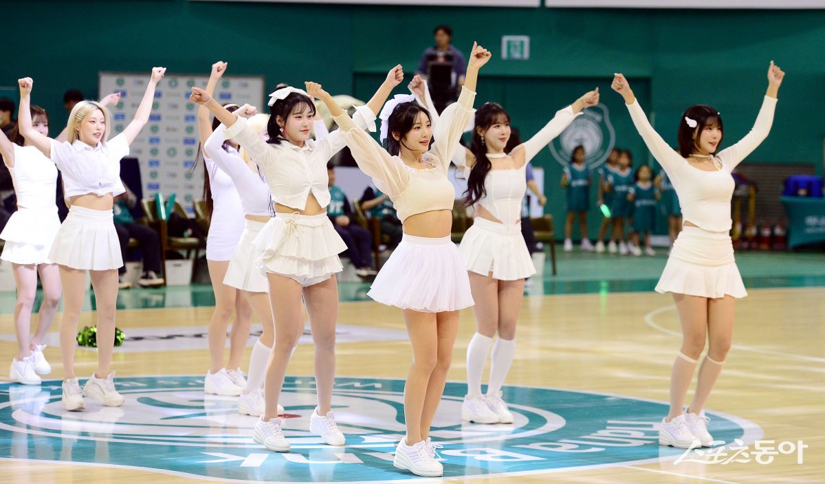 19일 경기도 부천체육관에서 열린 ‘하나은행 2024-2025 여자프로농구’ 하나은행과 BNK 썸의 경기에서 하나은행 치어리더가 화려한 공연을 펼치고 있다. 부천 | 김민성 기자 marineboy@donga.com