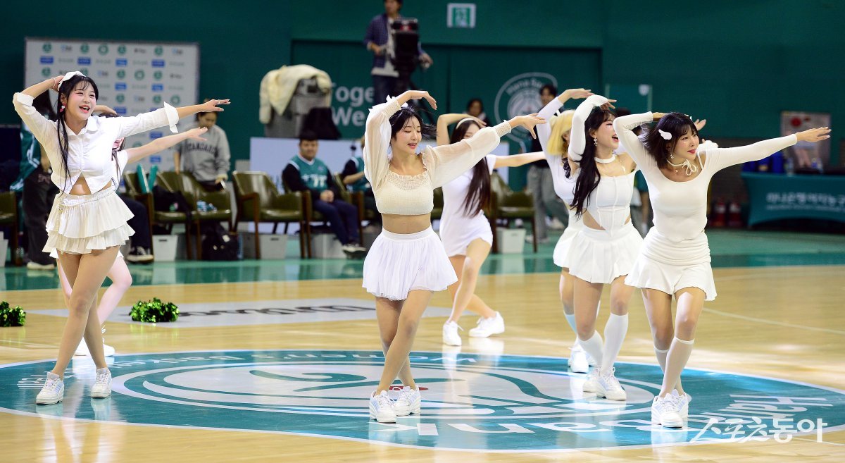 19일 경기도 부천체육관에서 열린 ‘하나은행 2024-2025 여자프로농구’ 하나은행과 BNK 썸의 경기에서 하나은행 치어리더가 화려한 공연을 펼치고 있다. 부천 | 김민성 기자 marineboy@donga.com