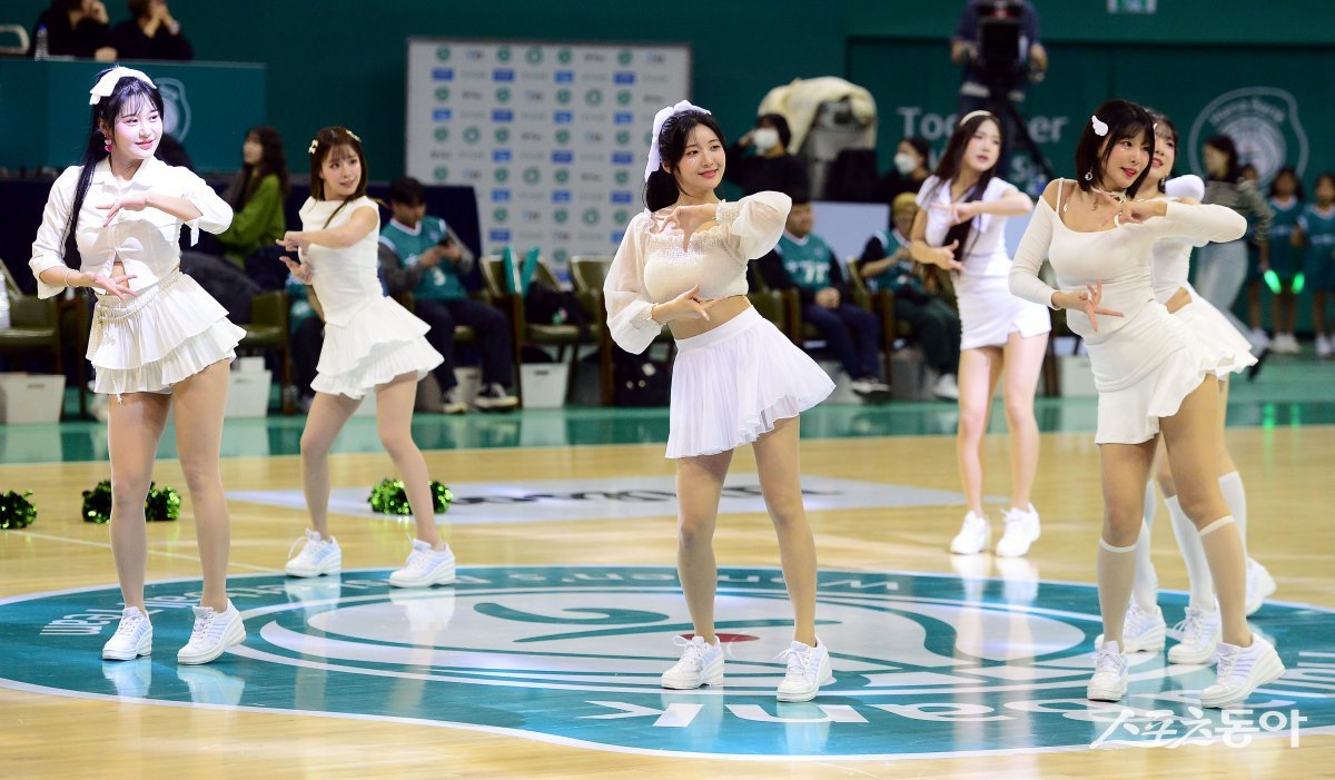 19일 경기도 부천체육관에서 열린 ‘하나은행 2024-2025 여자프로농구’ 하나은행과 BNK 썸의 경기에서 하나은행 치어리더가 화려한 공연을 펼치고 있다. 부천 | 김민성 기자 marineboy@donga.com