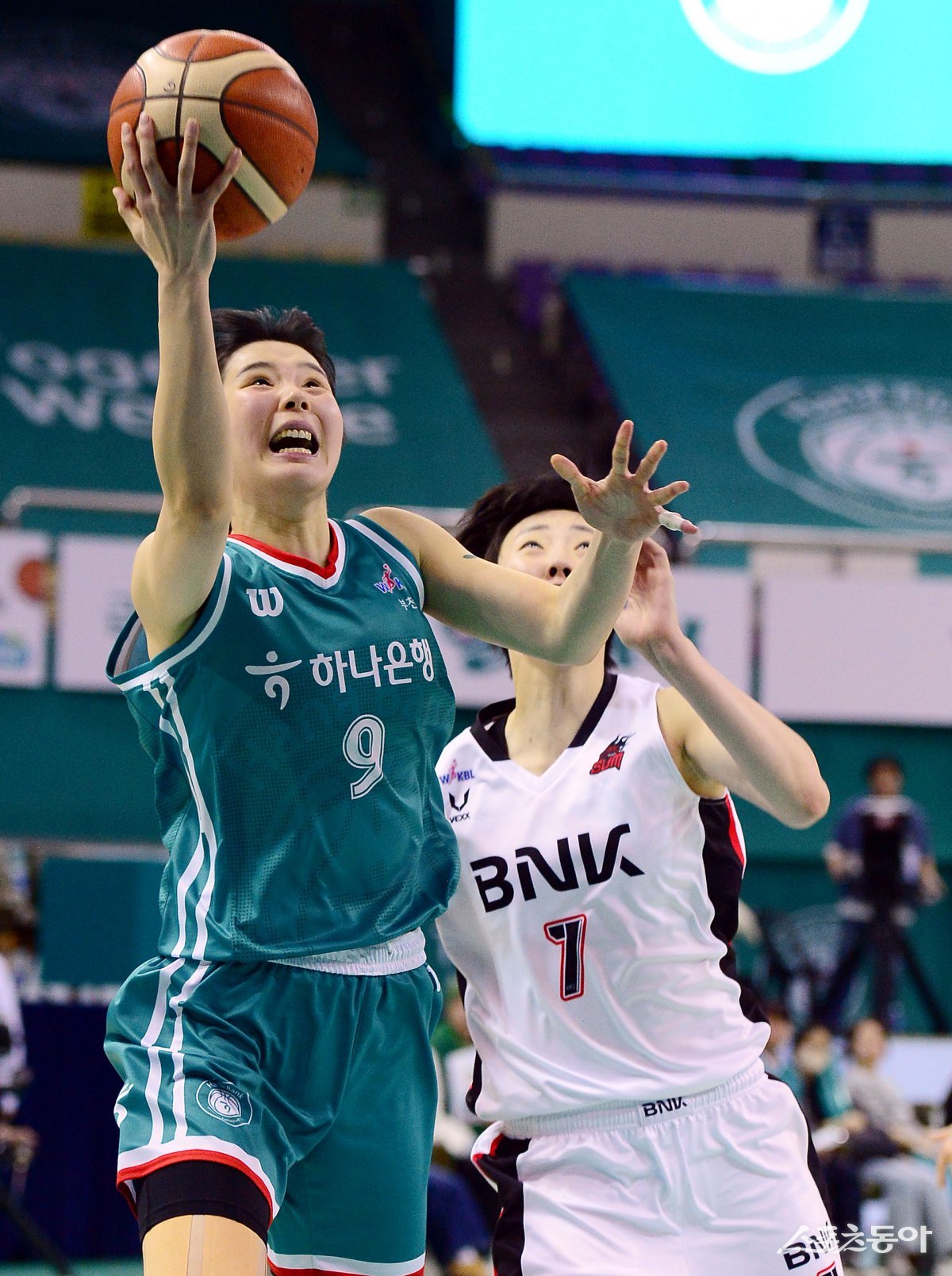 19일 경기도 부천체육관에서 열린 ‘하나은행 2024-2025 여자프로농구’ 하나은행과 BNK 썸의 경기에서 하나은행 김시온이 BNK 썸 박혜진의 수비를 피해 슛을 쏘고 있다. 부천 | 김민성 기자 marineboy@donga.com
