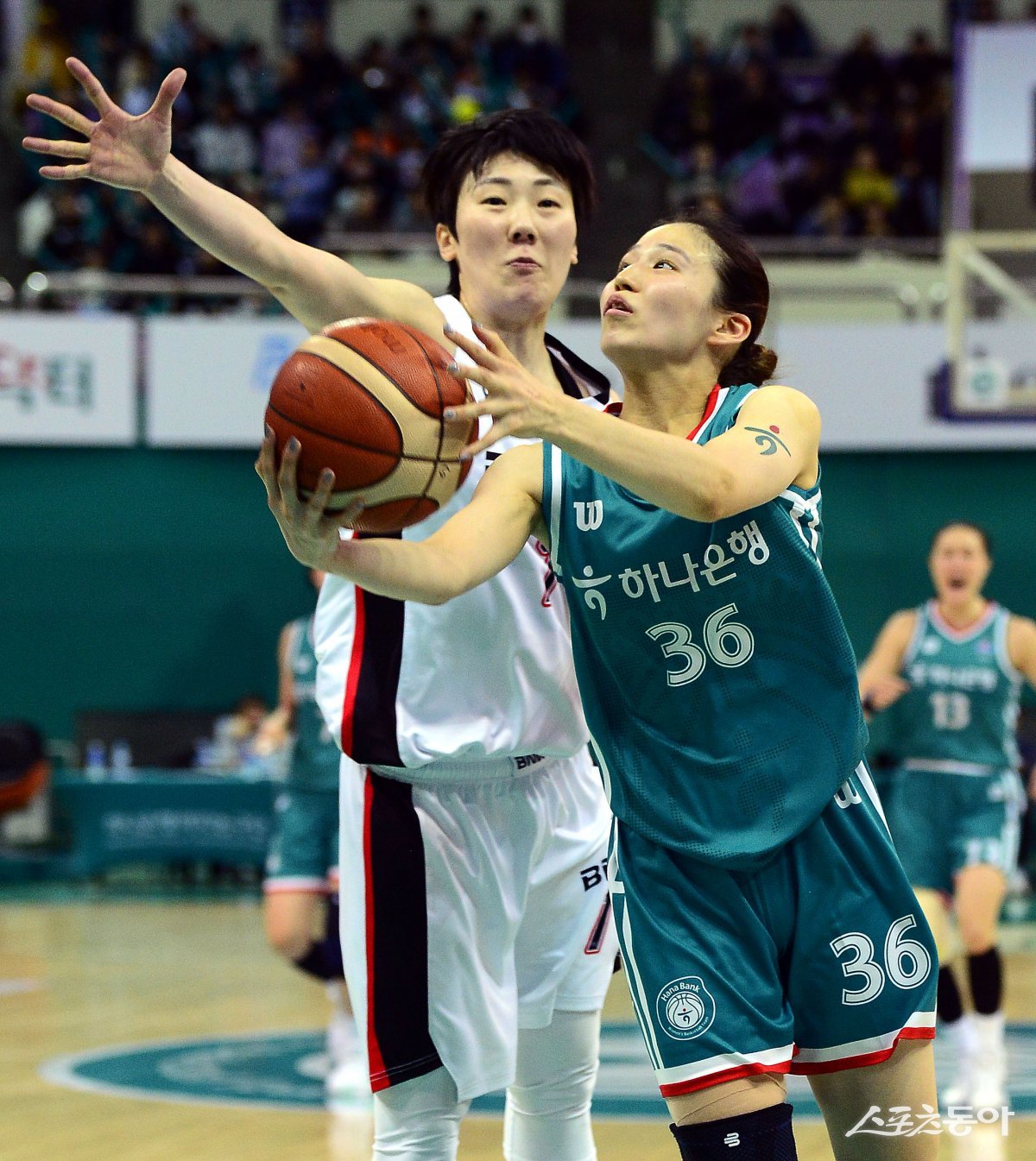 19일 경기도 부천체육관에서 열린 ‘하나은행 2024-2025 여자프로농구’ 하나은행과 BNK 썸의 경기에서 하나은행 유즈키가 BNK 썸 박혜진의 수비를 피해 슛을 쏘고 있다. 부천 | 김민성 기자 marineboy@donga.com