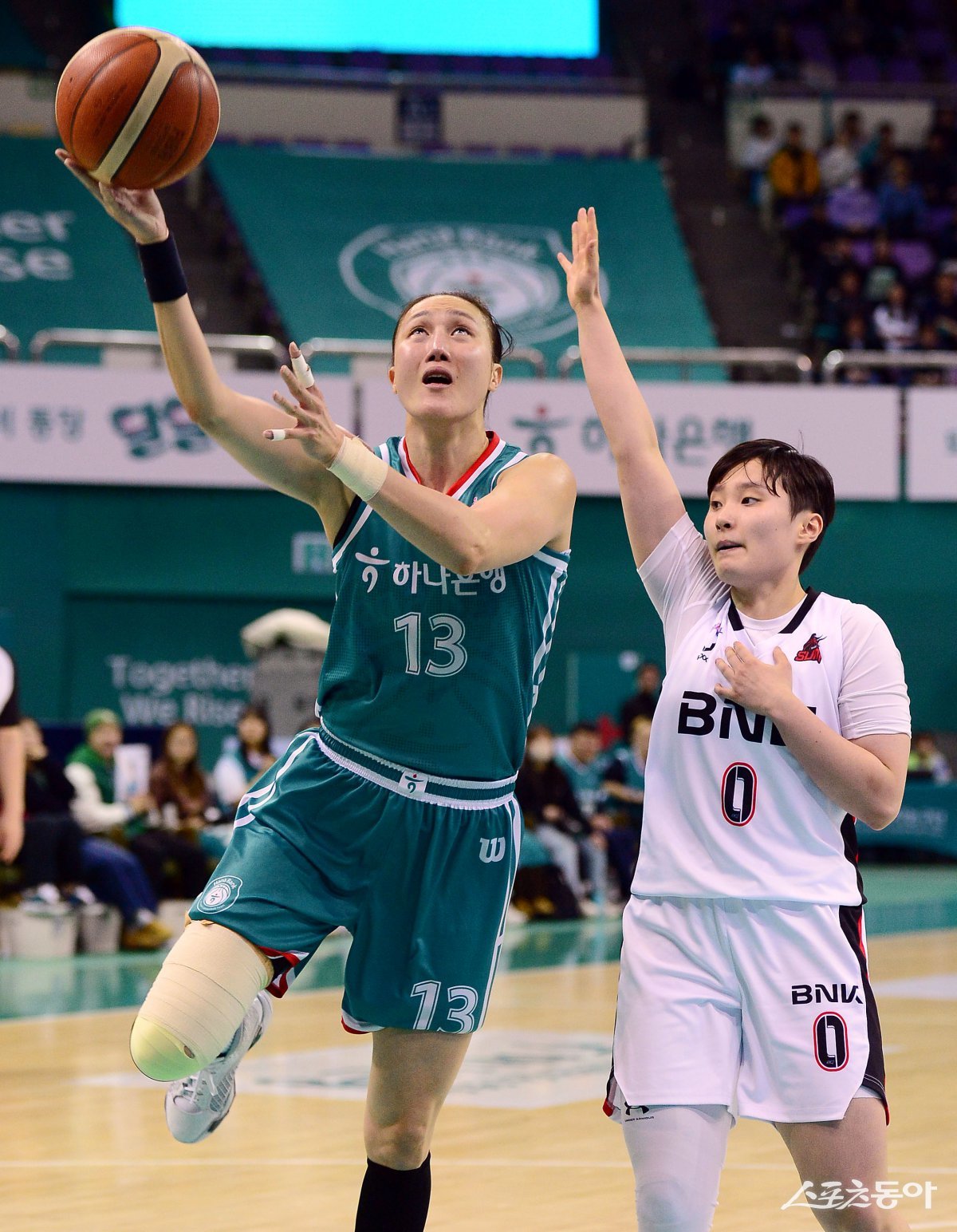 19일 경기도 부천체육관에서 열린 ‘하나은행 2024-2025 여자프로농구’ 하나은행과 BNK 썸의 경기에서 하나은행 김정은이 BNK 썸 심수현의 수비를 피해 슛을 쏘고 있다. 부천 | 김민성 기자 marineboy@donga.com
