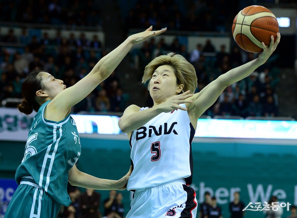 19일 경기도 부천체육관에서 열린 ‘하나은행 2024-2025 여자프로농구’ 하나은행과 BNK 썸의 경기에서 BNK 썸 안혜지가 하나은행 유즈키의 수비를 피해 슛을 쏘고 있다. 부천 | 김민성 기자 marineboy@donga.com