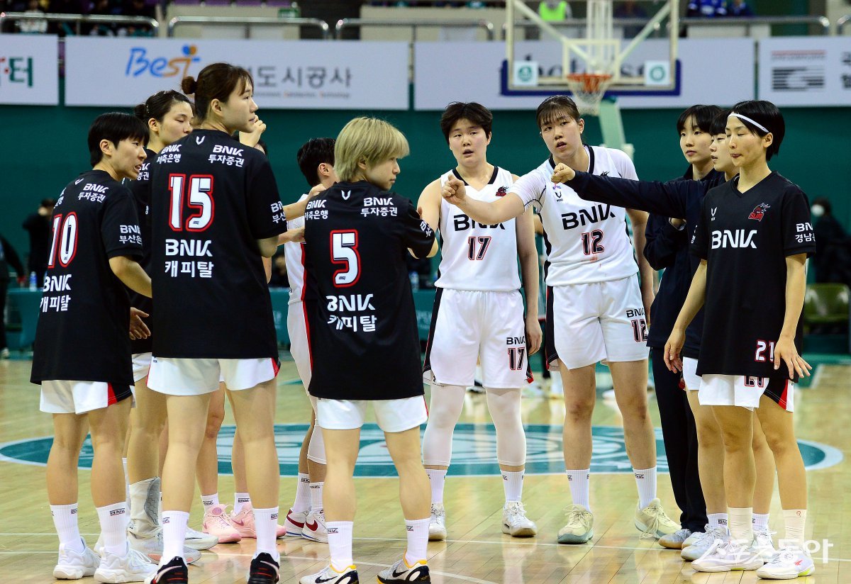 19일 경기도 부천체육관에서 열린 ‘하나은행 2024-2025 여자프로농구’ 하나은행과 BNK 썸의 경기에서 BNK 썸이 하나은행을 상대로 72-57 승리하며 2위를 확정지은 후 선수들이 코트에서 기쁨을 나누고 있다. 부천 | 김민성 기자 marineboy@donga.com