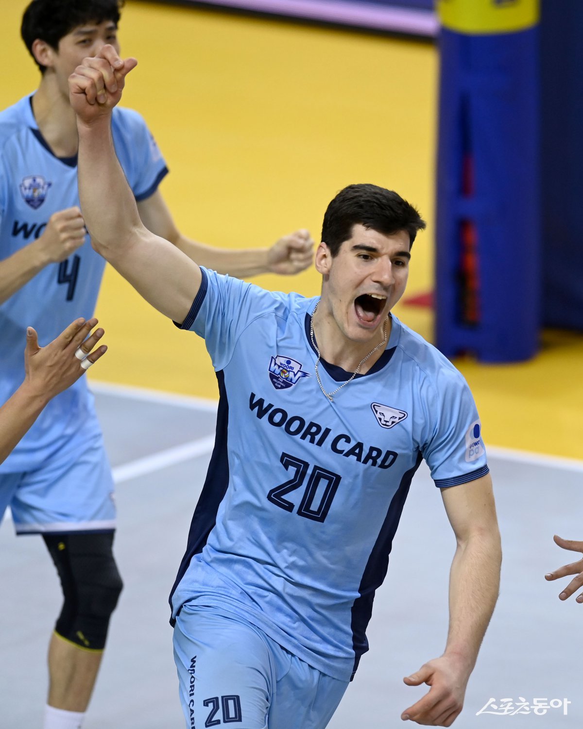 19일 의정부 경민대체육관에서 열린 ‘도드람 2024~2025 V-리그’ 남자부 KB손해보험과 우리카드 경기에서 우리카드 니콜리치가 득점에 성공한 후 기뻐하고 있다. 의정부 | 김종원 기자 won@donga.com