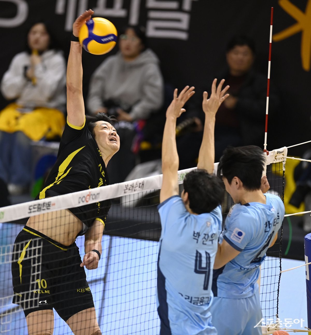 19일 의정부 경민대체육관에서 열린 ‘도드람 2024~2025 V-리그’ 남자부 KB손해보험과 우리카드 경기에서 KB손해보험 나경복이 우리카드의 블로킹 사이로 스파이크를 날리고 있다. 의정부 | 김종원 기자 won@donga.com