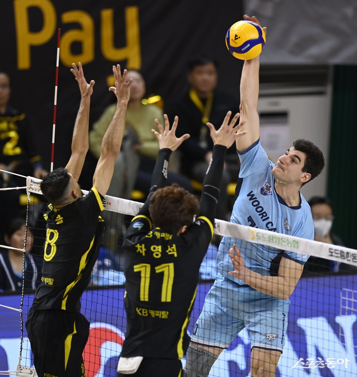 19일 의정부 경민대체육관에서 열린 ‘도드람 2024~2025 V-리그’ 남자부 KB손해보험과 우리카드 경기에서 우리카드 니콜리치가 KB손해보험의 블로킹 사이로 스파이크를 날리고 있다. 의정부 | 김종원 기자 won@donga.com