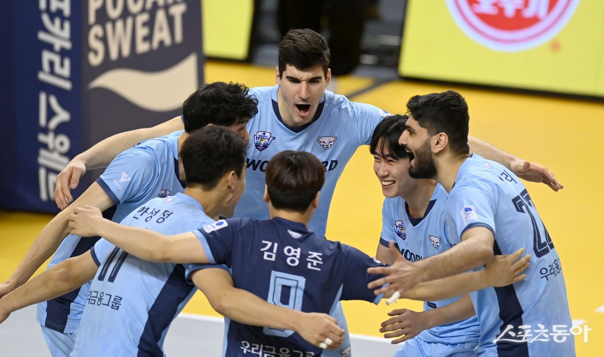 19일 의정부 경민대체육관에서 열린 ‘도드람 2024~2025 V-리그’ 남자부 KB손해보험과 우리카드 경기에서 우리카드 니콜리치가 득점에 성공한 후 기뻐하고 있다. 의정부 | 김종원 기자 won@donga.com
