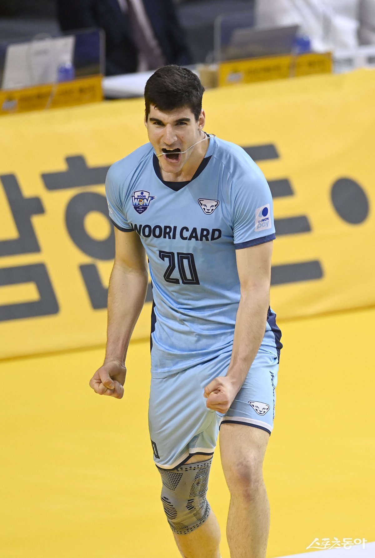 19일 의정부 경민대체육관에서 열린 ‘도드람 2024~2025 V-리그’ 남자부 KB손해보험과 우리카드 경기에서 우리카드 니콜리치가 득점에 성공한 후 기뻐하고 있다. 의정부 | 김종원 기자 won@donga.com