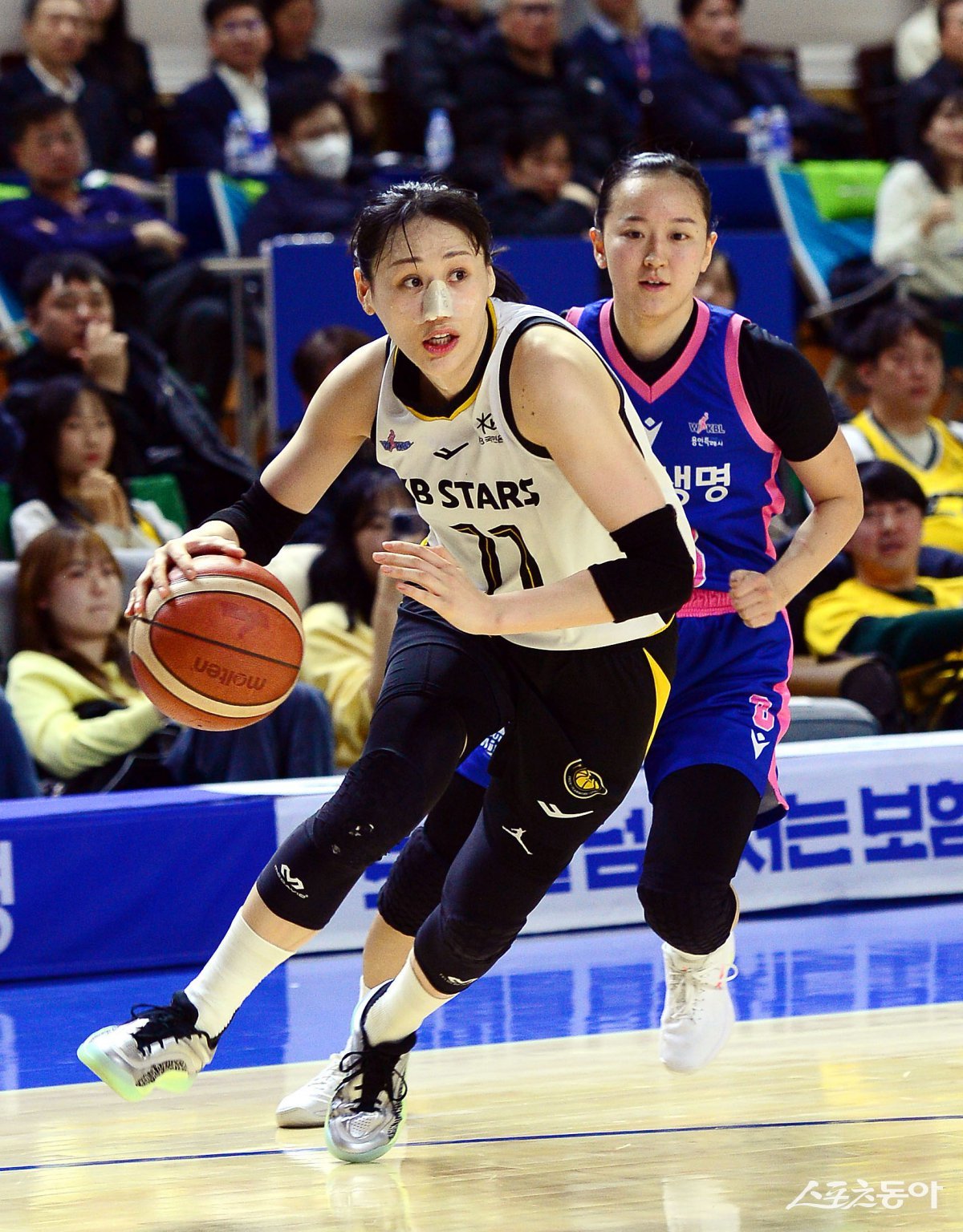 KB스타즈 강이슬(앞)이 20일 용인체육관에서 열린 삼성생명과 원정경기 도중 돌파를 시도하고 있다. 29점을 넣은 강이슬을 앞세운 KB스타즈가 삼성생명을 꺾고 정규리그 4위를 확정하며 PO행 막차 티켓을 따냈다. 용인|김민성 기자 marineboy@donga.com