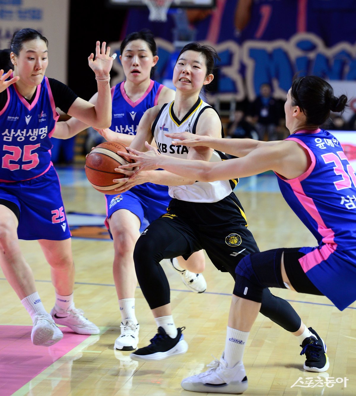 20일 경기도 용인실내체육관에서 열린 ‘하나은행 2024-2025 여자프로농구’ 삼성생명과 KB의 경기에서 KB 허예은이 삼성생명 수비 사이로 돌파를 시도하고 있다. 용인 | 김민성 기자 marineboy@donga.com