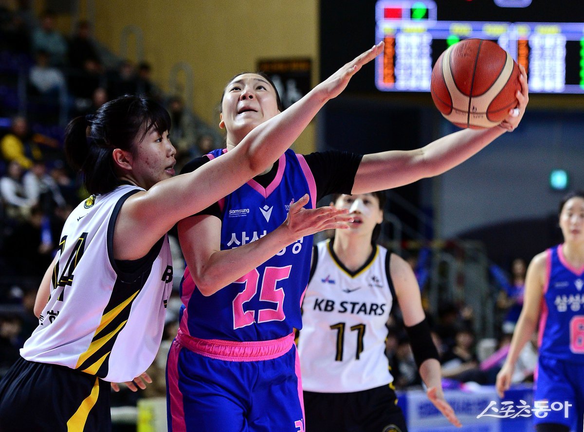 20일 경기도 용인실내체육관에서 열린 ‘하나은행 2024-2025 여자프로농구’ 삼성생명과 KB의 경기에서 삼성생명 배혜윤이 KB 송윤하의 수비를 피해 슛을 쏘고 있다. 용인 | 김민성 기자 marineboy@donga.com