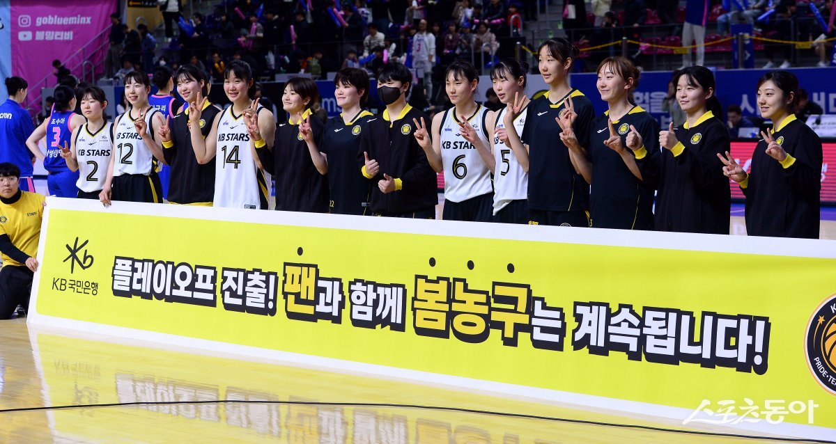 20일 경기도 용인실내체육관에서 열린 ‘하나은행 2024-2025 여자프로농구’ 삼성생명과 KB의 경기에서 KB가 삼성생명을 상대로 60-56 승리하며 플레이오프에 진출한 후 선수들이 기념촬영을 하고 있다. 용인 | 김민성 기자 marineboy@donga.com