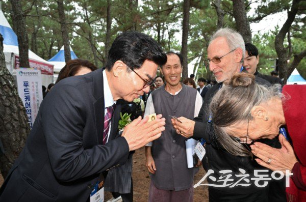 김광열 영덕군수가 국제 H-웰니스 페스타 참가 외국인 부부와 인사를 나누고 있다. 사진제공 ㅣ 영덕군