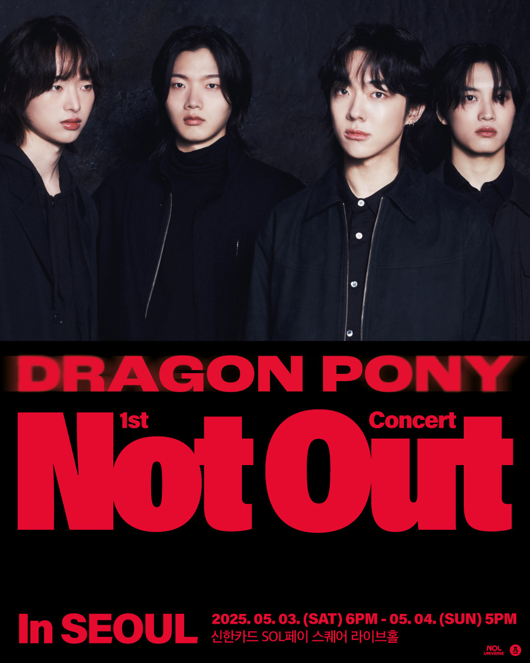 밴드신을 달굴 그 첫걸음으로 드래곤포니는 오는 5월 3~4일 서울 마포구 신한카드 SOL페이 스퀘어 라이브홀에서 데뷔 첫 단독 콘서트 ‘Dragon Pony (드래곤포니) 1st Concert ’Not Out‘ in Seoul’을 연다. 드래곤포니는 청춘의 에너지를 녹인 무대로 관객들과 호흡할 예정이다.