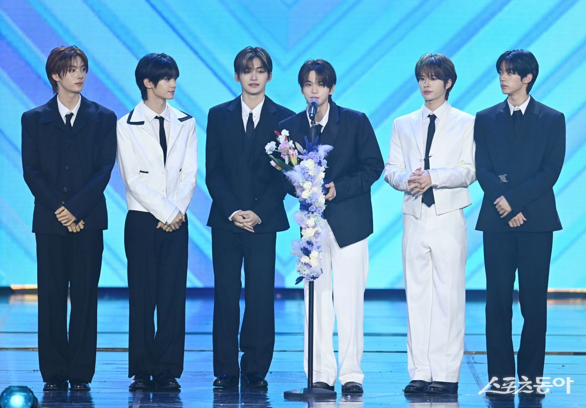 스포츠동아가 주최하고 ‘유픽(upick)’과 WSM이 주관하는 ‘유픽과 함께 하는 제1회 디 어워즈(D Awards with upick)’(주최: 스포츠동아, WSM · 주관: UPICK, WSM · 후원: G.K Link, ITTA)가 22일 서울 고려대학교 화정체육관에서 개최됐다. 디 어워즈 딜라이트 블루라벨(D*AWARDS DELIGHTS BLUE LABEL)를 수상한 투어스(TWS)가 수상 소감을 밝히고 있다. 주현희 기자 teth1147@donga.com