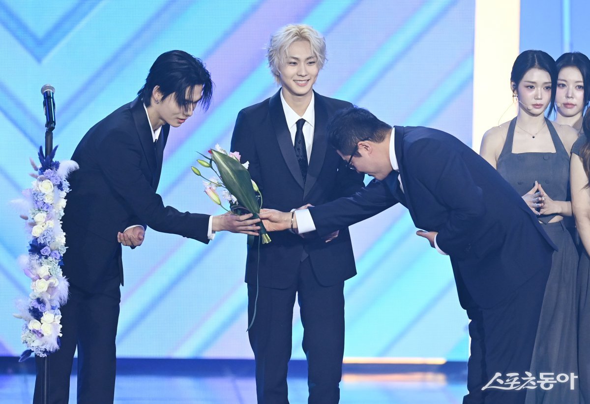 스포츠동아가 주최하고 ‘유픽(upick)’과 WSM이 주관하는 ‘유픽과 함께 하는 제1회 디 어워즈(D Awards with upick)’(주최: 스포츠동아, WSM · 주관: UPICK, WSM · 후원: G.K Link, ITTA)가 22일 서울 고려대학교 화정체육관에서 개최됐다. 디 어워즈 UPICK 인기상을 수상한 ENHYPEN(엔하이픈)이 임찬 유픽 대표로부터 트로피와 꽃다발을 받고 있다. 주현희 기자 teth1147@donga.com