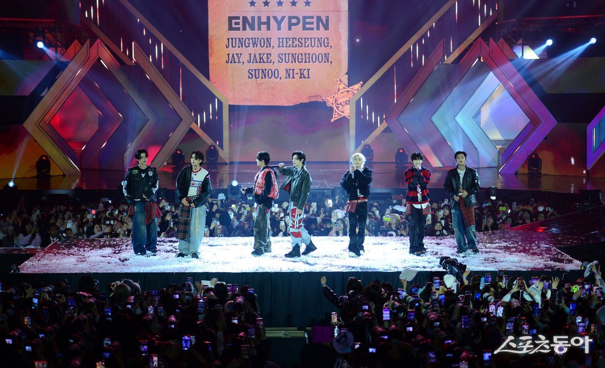 스포츠동아가 주최하고 ‘유픽(upick)’과 WSM이주관하는 ‘유픽과 함께 하는 제1회 디 어워즈(D Awards with upick)’(주최: 스포츠동아, WSM · 주관: UPICK, WSM · 후원: G.K Link, ITTA)가 22일 서울 고려대학교 화정체육관에서 개최됐다. 디 어워즈 시상식에 참석한 ENHYPEN(엔하이픈)이 공연을 펼치고 있다. . . 김종원 기자 won@donga.com