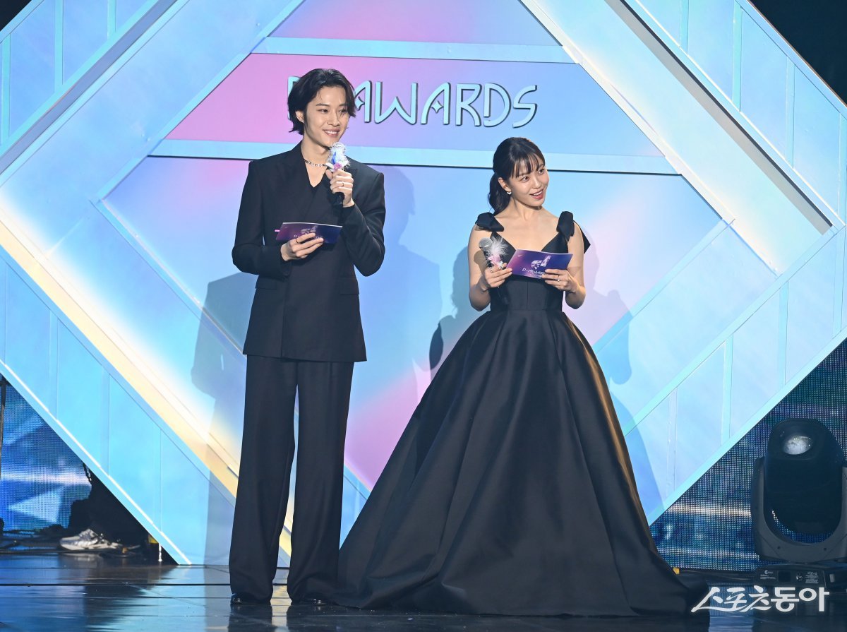 스포츠동아가 주최하고 ‘유픽(upick)’과 WSM이 주관하는 ‘유픽과 함께 하는 제1회 디 어워즈(D Awards with upick)’(주최: 스포츠동아, WSM · 주관: UPICK, WSM · 후원: G.K Link, ITTA)가 22일 서울 고려대학교 화정체육관에서 개최됐다. MC를 맡은 이종원과 고민시가 시상식을 진행하고 있다. 주현희 기자 teth1147@donga.com