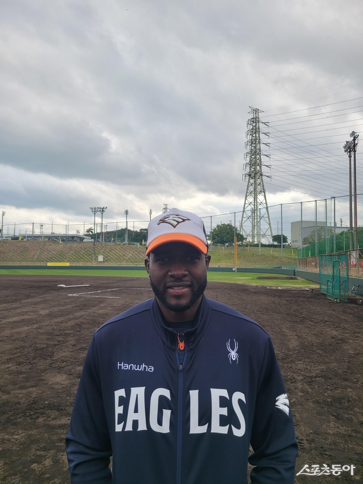 한화 에스테반 플로리얼이 22일 일본 오키나와 구시카와구장에서 스포츠동아와 인터뷰를 진행한 뒤 사진촬영을 하고 있다. 플로리얼은 이날 경기에서 5회초 역전 3점홈런을 때리며 3타수 1안타 1홈런 3타점 1득점의 맹활약을 펼쳤다. 오키나와(일본)|장은상 기자 award@donga.com