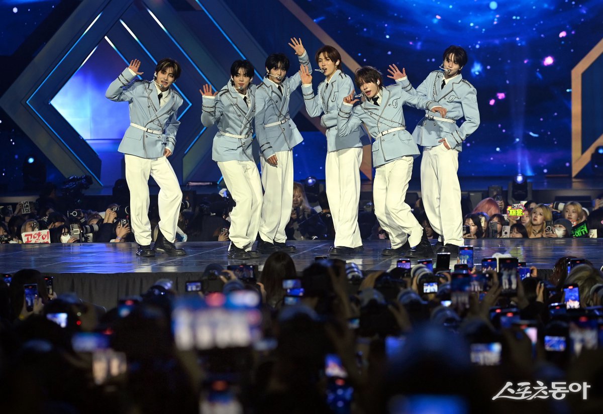 스포츠동아가 주최하고 ‘유픽(upick)’과 WSM이주관하는 ‘유픽과 함께 하는 제1회 디 어워즈(D Awards with upick)’(주최: 스포츠동아, WSM · 주관: UPICK, WSM · 후원: G.K Link, ITTA)가 22일 서울 고려대학교 화정체육관에서 개최됐다. 디 어워즈 시상식에 참석한 투어스(TWS)가 공연을 펼치고 있다. 김민성 기자 marineboy@donga.com