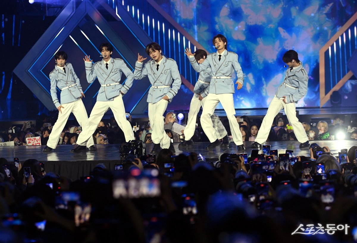 스포츠동아가 주최하고 ‘유픽(upick)’과 WSM이주관하는 ‘유픽과 함께 하는 제1회 디 어워즈(D Awards with upick)’(주최: 스포츠동아, WSM · 주관: UPICK, WSM · 후원: G.K Link, ITTA)가 22일 서울 고려대학교 화정체육관에서 개최됐다. 디 어워즈 시상식에 참석한 투어스(TWS)가 공연을 펼치고 있다. 김민성 기자 marineboy@donga.com