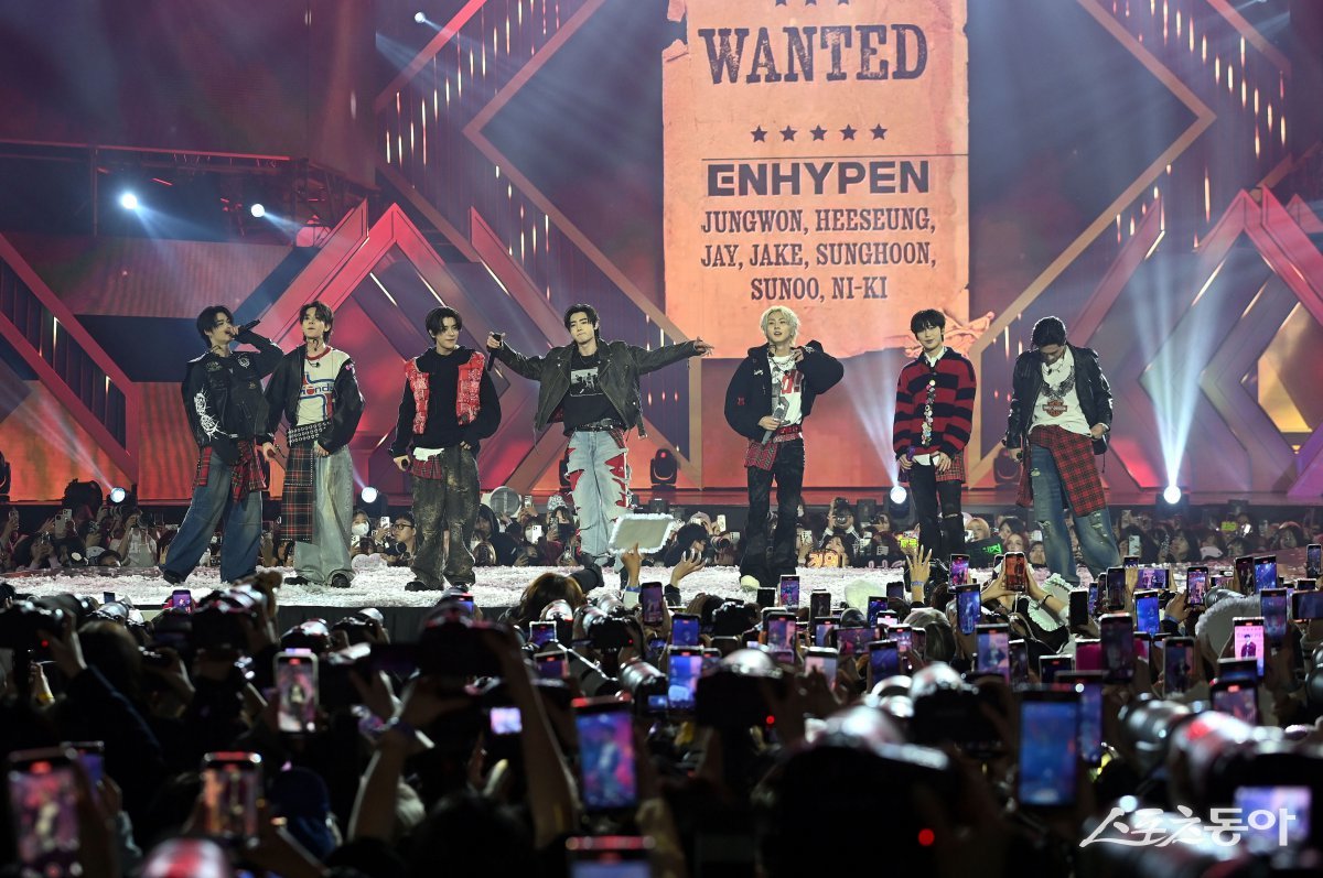 스포츠동아가 주최하고 ‘유픽(upick)’과 WSM이주관하는 ‘유픽과 함께 하는 제1회 디 어워즈(D Awards with upick)’(주최: 스포츠동아, WSM · 주관: UPICK, WSM · 후원: G.K Link, ITTA)가 22일 서울 고려대학교 화정체육관에서 개최됐다. 디 어워즈 시상식에 참석한 ENHYPEN(엔하이픈)이 공연을 펼치고 있다. 김민성 기자 marineboy@donga.com