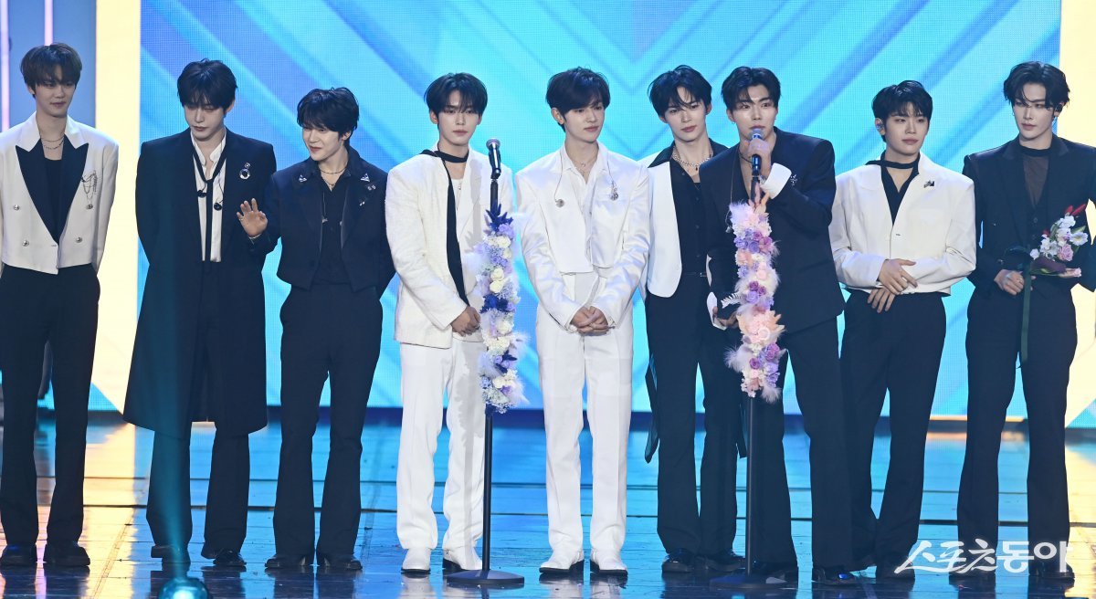 스포츠동아가 주최하고 ‘유픽(upick)’과 WSM이 주관하는 ‘유픽과 함께 하는 제1회 디 어워즈(D Awards with upick)’(주최: 스포츠동아, WSM · 주관: UPICK, WSM · 후원: G.K Link, ITTA)가 22일 서울 고려대학교 화정체육관에서 개최됐다. 디 어워즈 블랙라벨 올해의 레코드(D*AWARDS BLACK LABEL Record of the Year)에 선정된 ZEROBASEONE(제로베이스원)이 수상 소감을 밝히고 있다. 주현희 기자 teth1147@donga.com