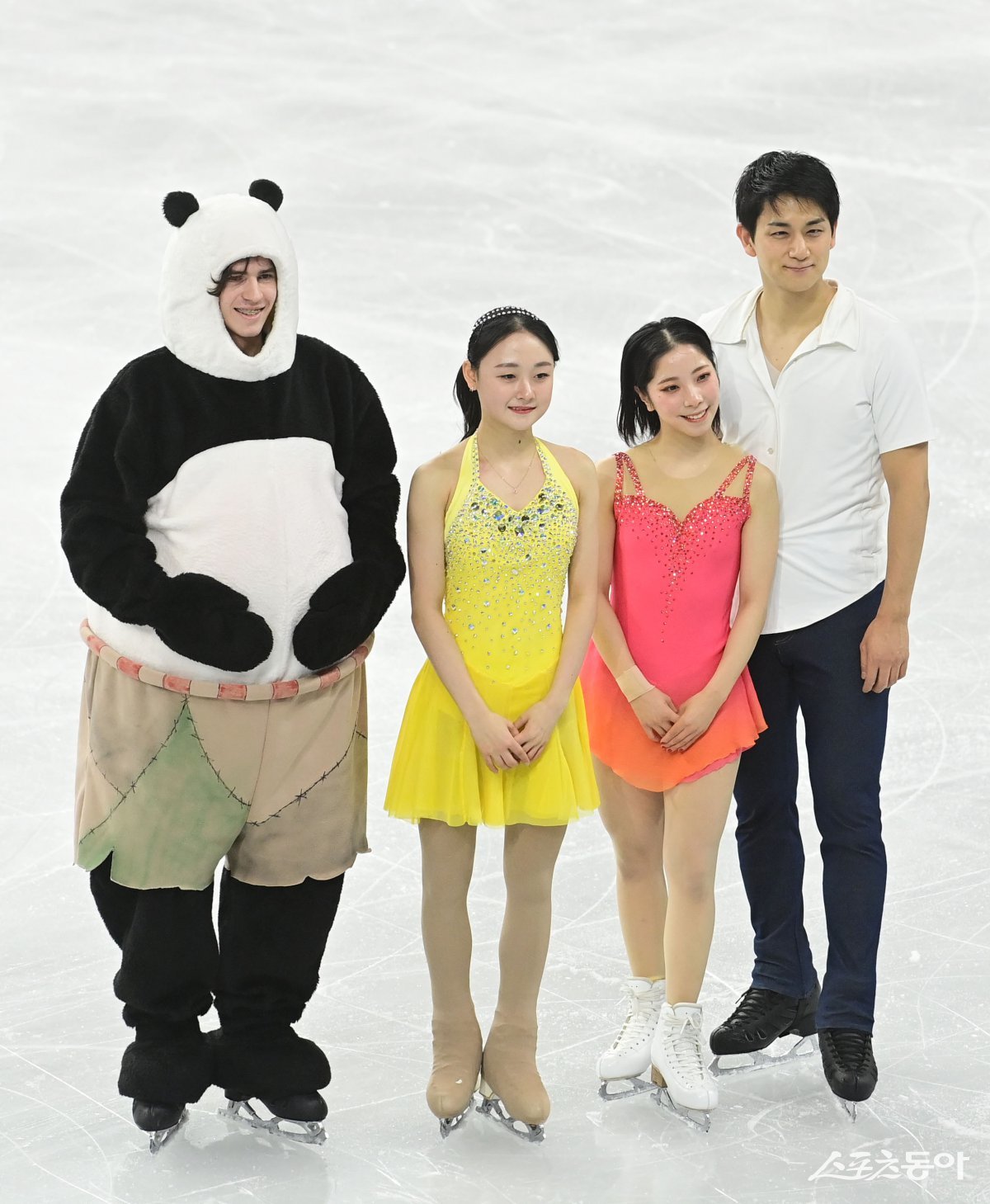 왼쪽부터 남자 싱글 카자흐스탄 미하일 샤이도로프, 여자 싱글 대한민국 김채연, 페어 부문 일본 미우라 리쿠, 키하라 류이치가 23일 서울 목동종합운동장 목동아이스링크에서 열린 ‘4대륙 피겨스케이팅 선수권대회’ 갈라쇼를 마친 후 기념 촬영을 하고 있다. 목동 | 주현희 기자 teth1147@donga.com